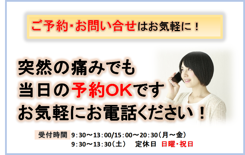 申し訳ありませんが、施術中はお電話に出られない事もあります。その際は留守番電へ「お名前・ご連絡先・ご用件」を伝えてください。後ほど折り返しお電話致します。